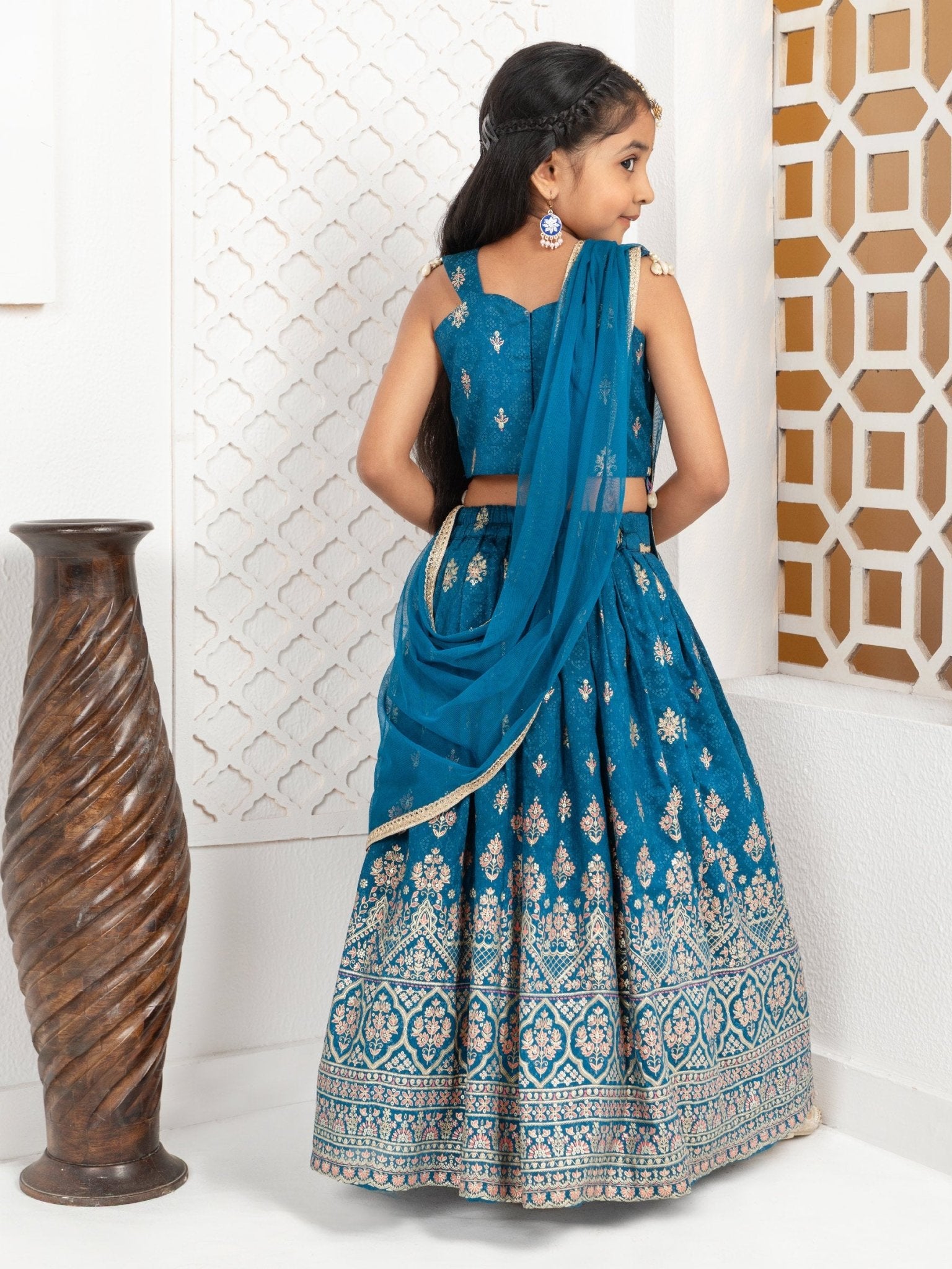 Captivating foil print lehenga set with trim detailing top, embellished dupatta & potli bag